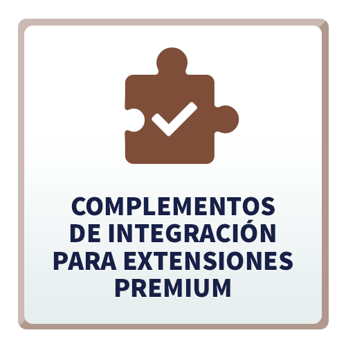 Hay 2 extensiones que no entran en la categoría del “Paquete de Extensiones Premium para Expertos”. La razón es que son “Complementos de Integración” y dependen de una aplicación de terceros . Tales integraciones requieren mucho más tiempo de desarrollo, soporte y mantenimiento más importante. Estas extensiones (Complementos de Integración) son :